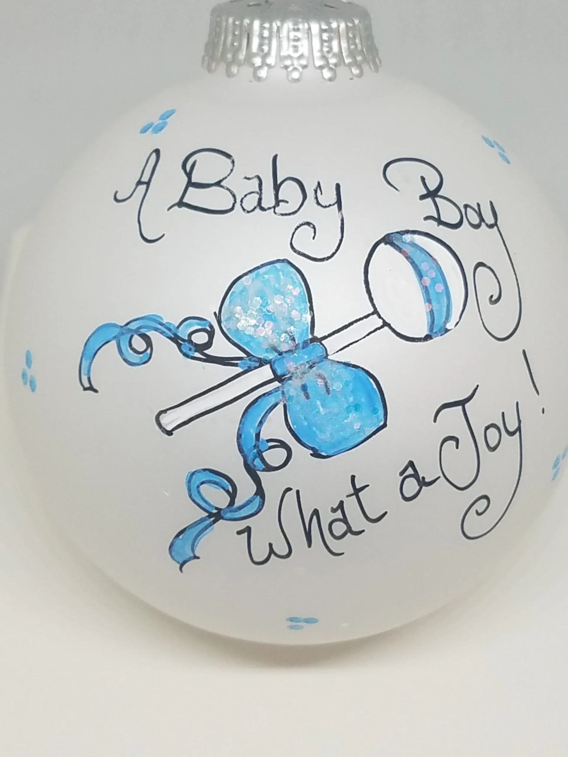 Inspired By The Heartfelt Nature Of Special Occasions, This Baby Boy Joy Painted Heartfelt Glass Ornament Helps To Celebrate Those Moments Of Happiness To Congratulate A Couple With A Baby Boy, Truly A Gift Of Joy And Love. This Ornament Is Perfect For An Anniversary, Engagement, Wedding, New Job, New Home, Graduation Or Any Event A Toast Can Be Involved! The Artistry On These Glass Ball Ornaments Is Beautiful And Often Embellished With Swarovsky Crystals, Glitter, And Whimsy. These Glass Ornaments Are Each Painted By Hand By Artists With Acrylic Paints And Available Online And At The Christmas Vacation Shop.
