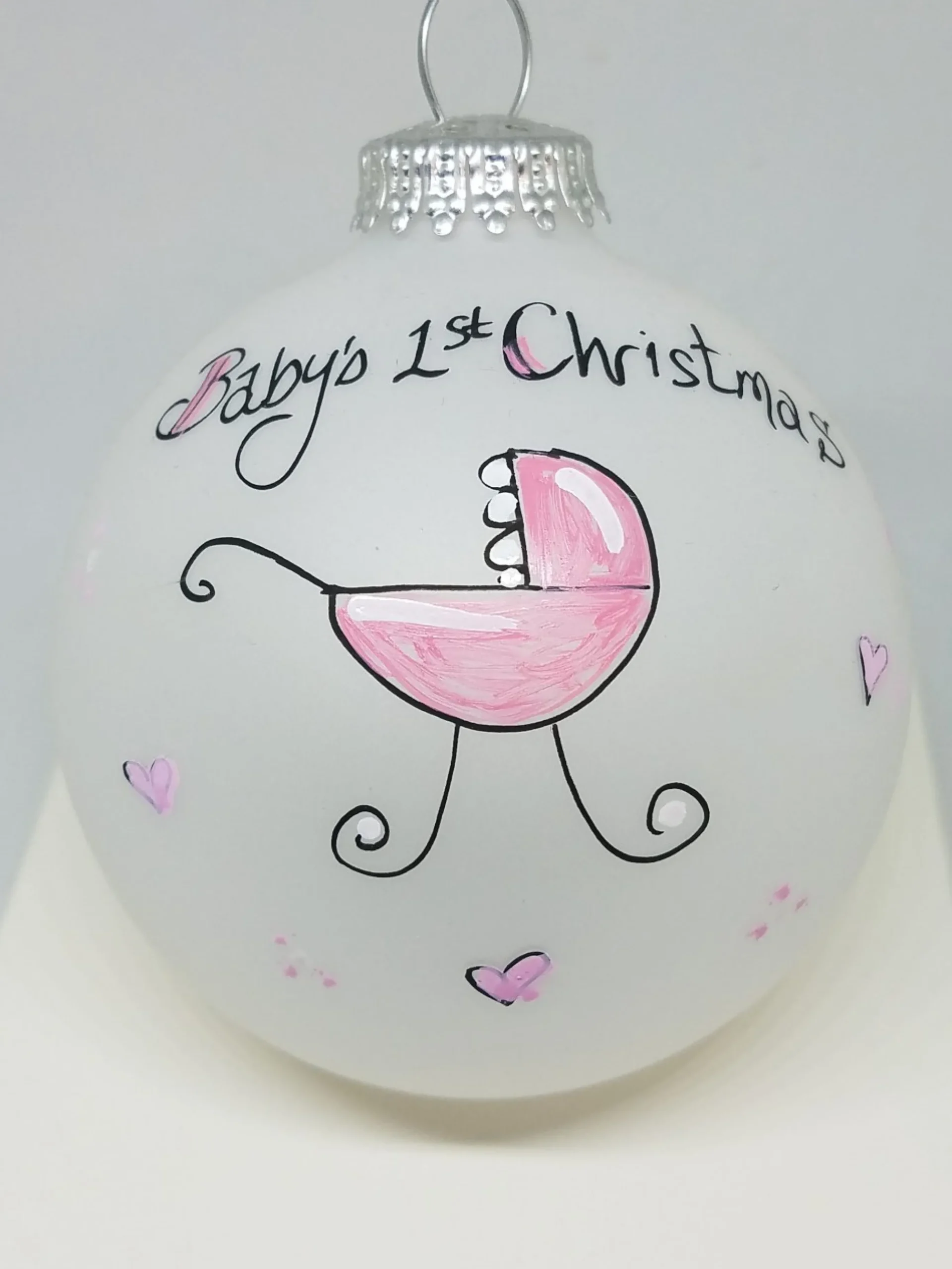 Inspired By The Heartfelt Nature Of Special Occasions, This Baby Girl First Christmas Carriage Heartfelt Glass Ornament Helps To Celebrate Those Moments Of Happiness To Congratulate A Couple With A Baby Girl, Truly A Gift Of Love. This Ornament Is Perfect For An Anniversary, Engagement, Wedding, New Job, New Home, Graduation Or Any Event A Toast Can Be Involved! The Artistry On These Glass Ball Ornaments Is Beautiful And Often Embellished With Swarovski Crystals, Glitter, And Whimsy. These Glass Ornaments Are Each Painted By Hand By Artists With Acrylic Paints And Available Online And At The Christmas Vacation Shop.