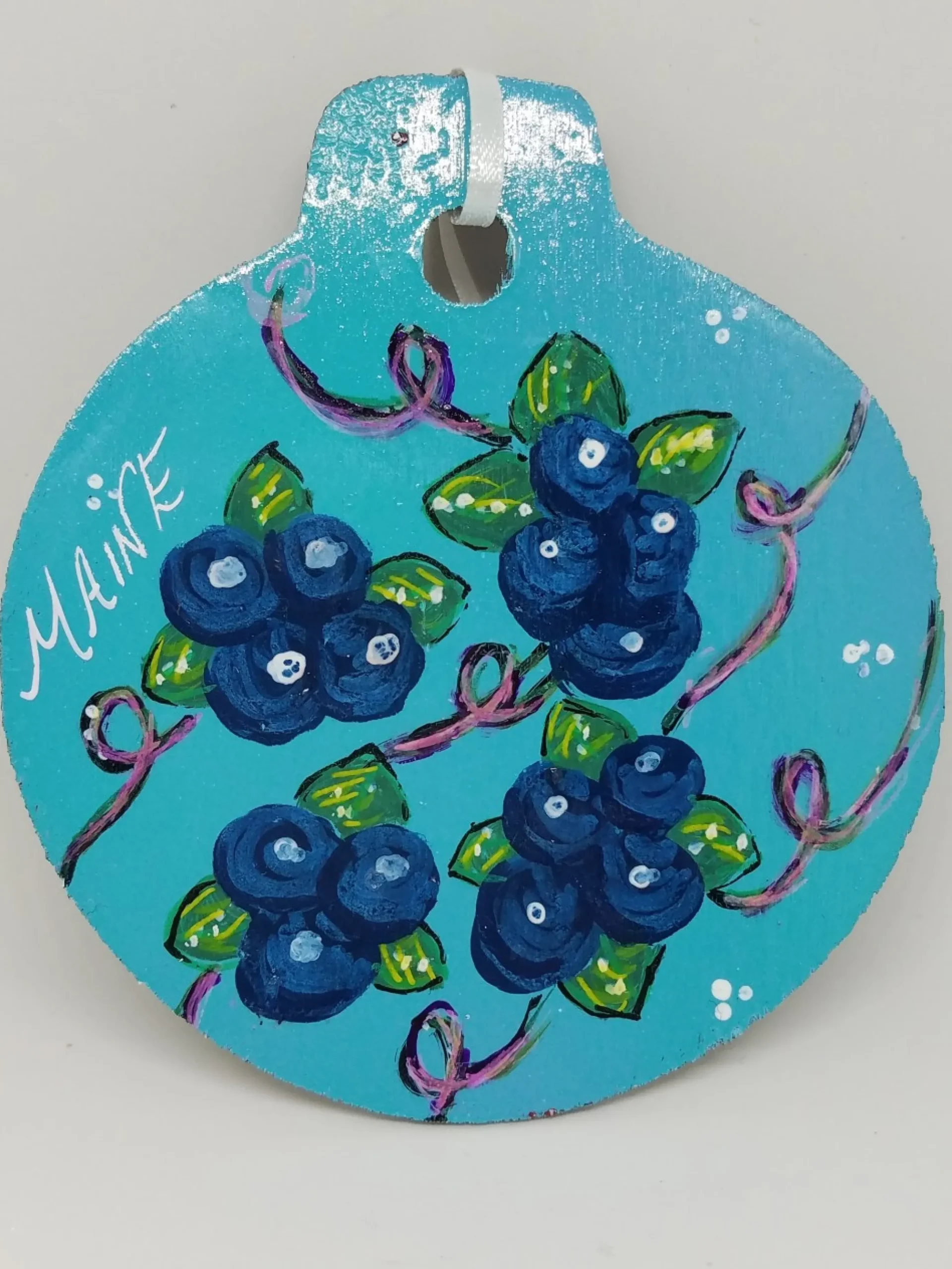 The Blueberry Painted Wood Ornament Is A Great Addition To Your Ornament Collection. It Features A Handpainted Image Of Blueberries. Wild Maine Blueberries Are Found Growing In Low Lying Bushes All Throughout Maine. Artists Paint Each Image With Acrylic Colors To Add Detail To The Painted Wood Ornament. They Are Unique And Exclusive To The Christmas Vacation Shop.