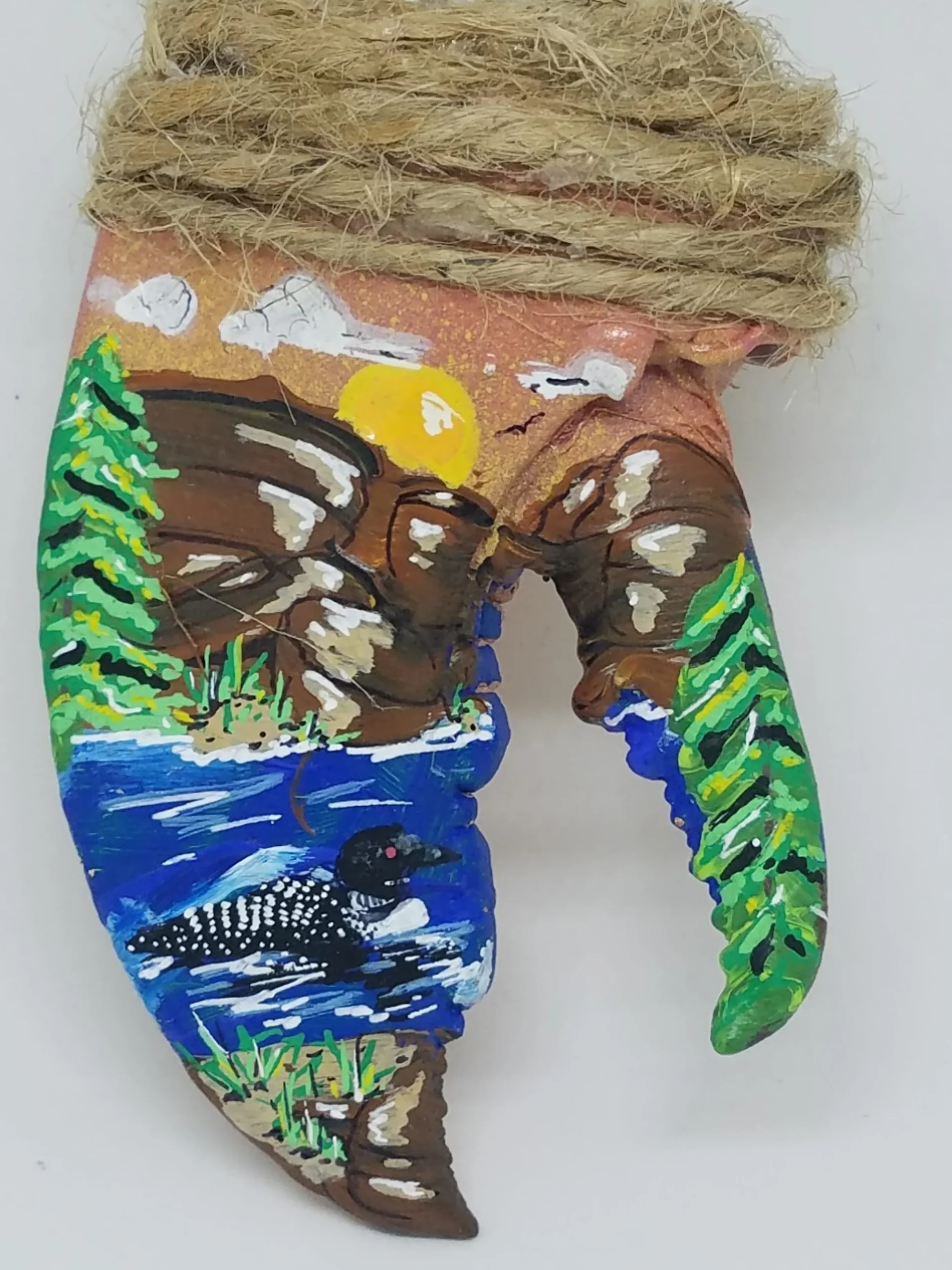 The Forest Lake Scene With Loon In Water Lobster Claw Is Made From Genuine Maine Lobster Claws And Depicts A Serene Setting As A Loon Swims In A Pond Or Lake In The Clearing Of A Mountain Scene. We See This Scene Throughout Acadia National Park And The Lakes Here In Maine. It Is One Of The Most Relaxing And Calming Views And We Hope It Shares That Feeling With You Too! Lobster Claw Ornaments Are Perhaps One Of The Most Unique Ways To Blend Natural Resources With Art. Each Ornament Is Made And Assembled By Hand And Then Handpainted In Maine By Artists At The Christmas Vacation Shop