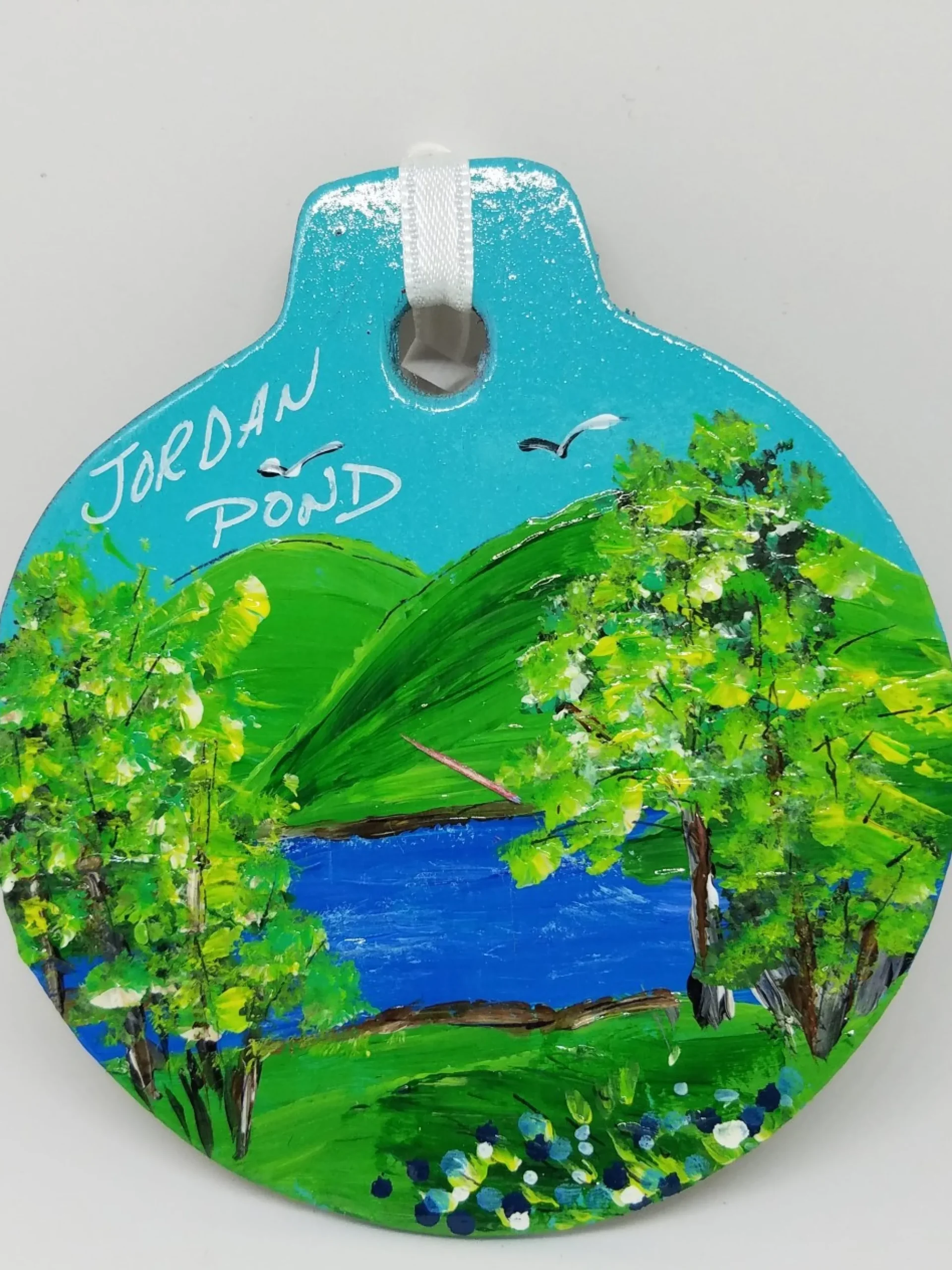 The Jordan Pond Acadia Painted Wood Ornament Is A Great Addition To Your Ornament Collection. It Features A Handpainted Image Of Jordan Pond In Acadia National Park. Artists Paint Each Image With Acrylic Colors To Add Detail To The Painted Wood Ornament. They Are Unique And Exclusive To The Christmas Vacation Shop.