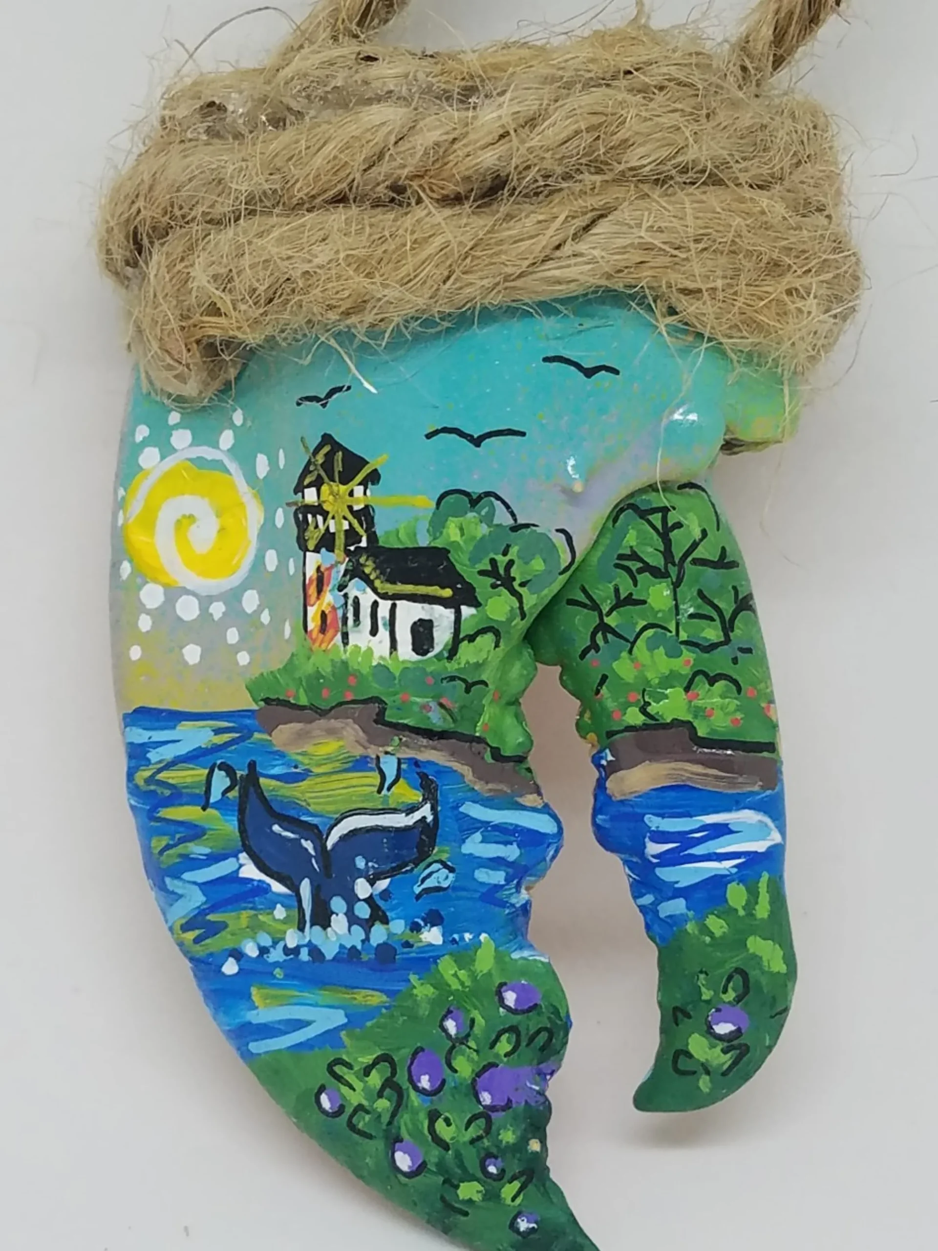 The Lighthouse With Whale Tail And Blue Sky Lobster Claw Ornament Is Made From Genuine Maine Lobster Claws. Whales Are Spotted In New England Coastal Waters And This Ornament Reflects The Blend Of A Perfect Coastal Scene, Complete With Blueberry Bushes On A Mountainside Overlooking The Ocean. Lobster Claw Ornaments Are Perhaps One Of The Most Unique Ways To Blend Natural Resources With Art. Each Ornament Is Made And Assembled By Hand And Then Handpainted In Maine By Artists At The Christmas Vacation Shop